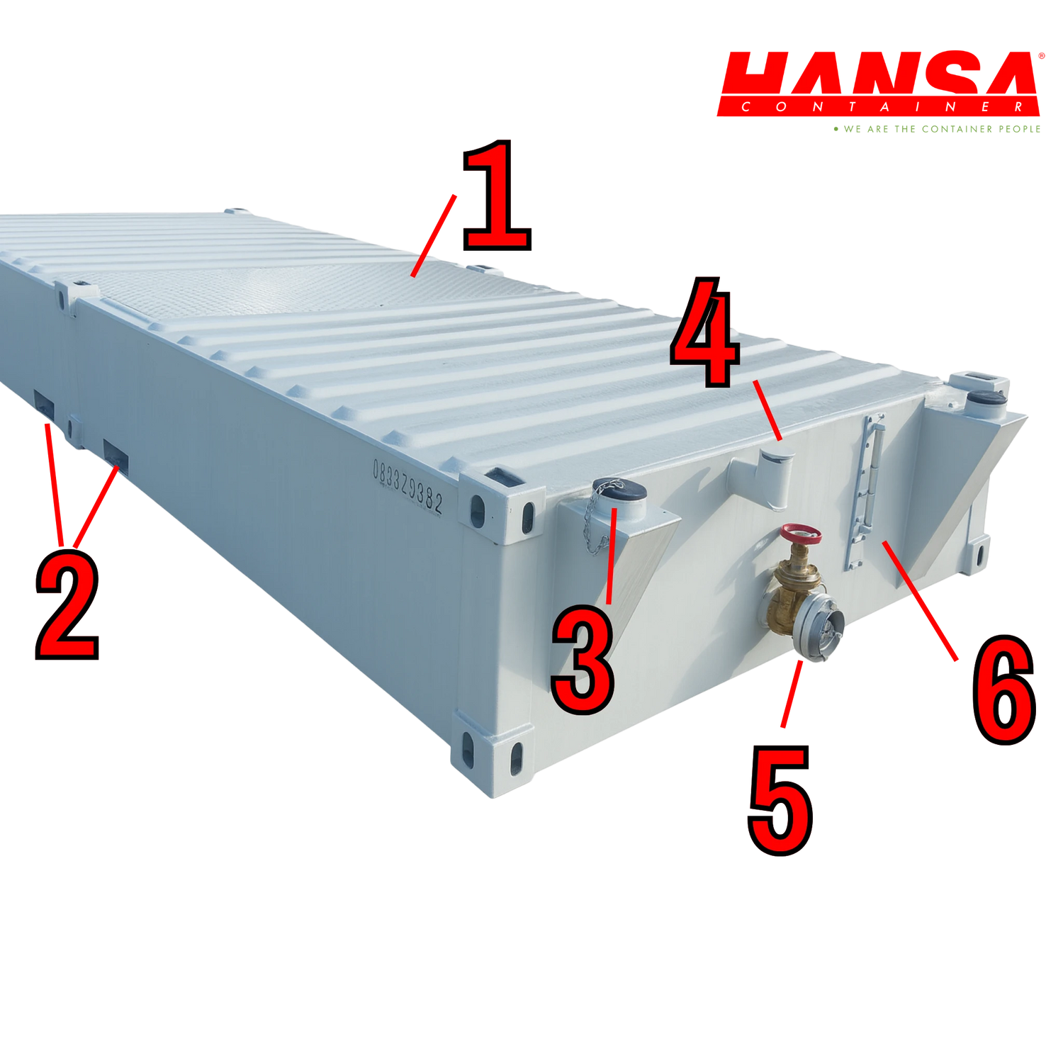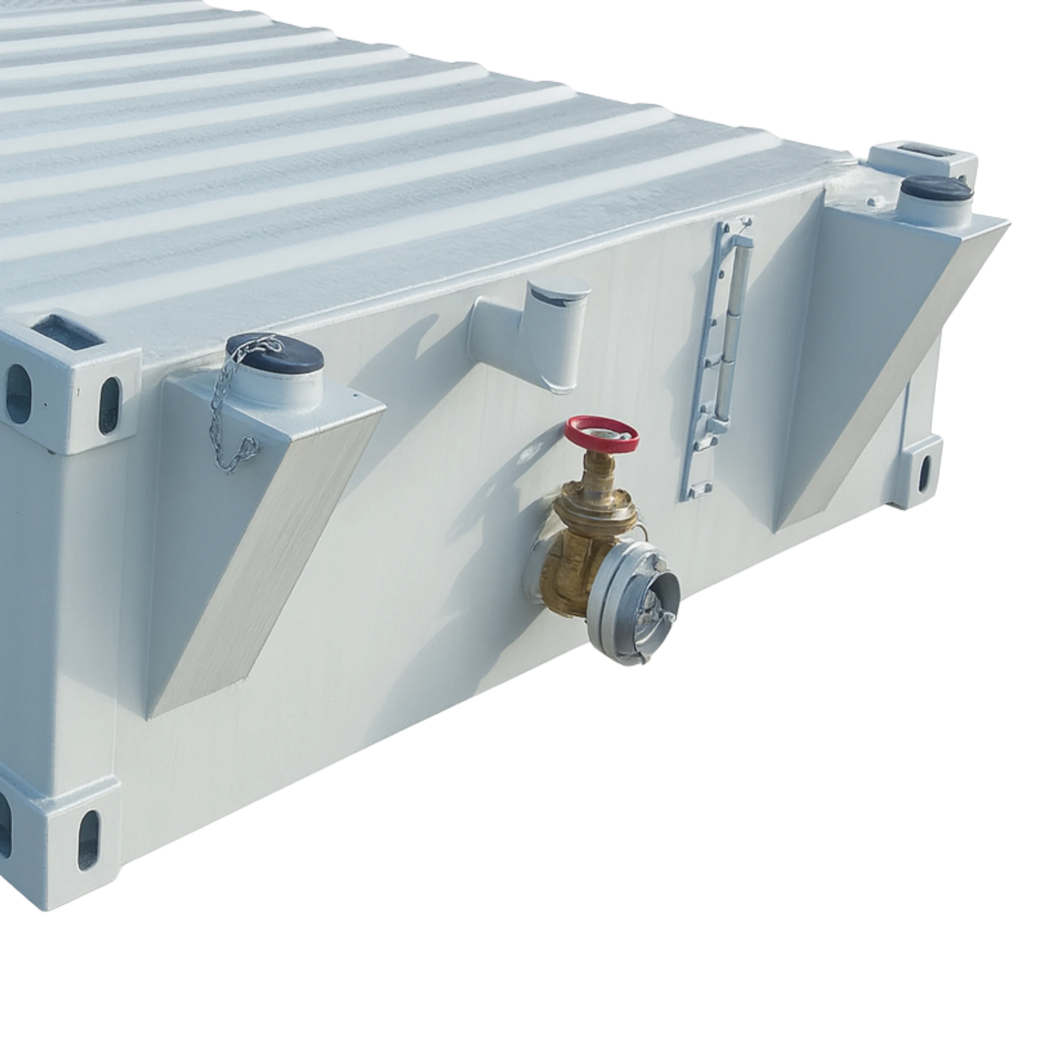 Optional sind Zugangstreppe oder ein 4’’ Flanschkugelhahn verfügbar. In Kombination mit einem 20’ Sanitärcontainer Damen/Herren oder einem Duschcontainer entsteht eine komplett autarke mobile Sanitäranlage, ideal für Langzeitprojekte.