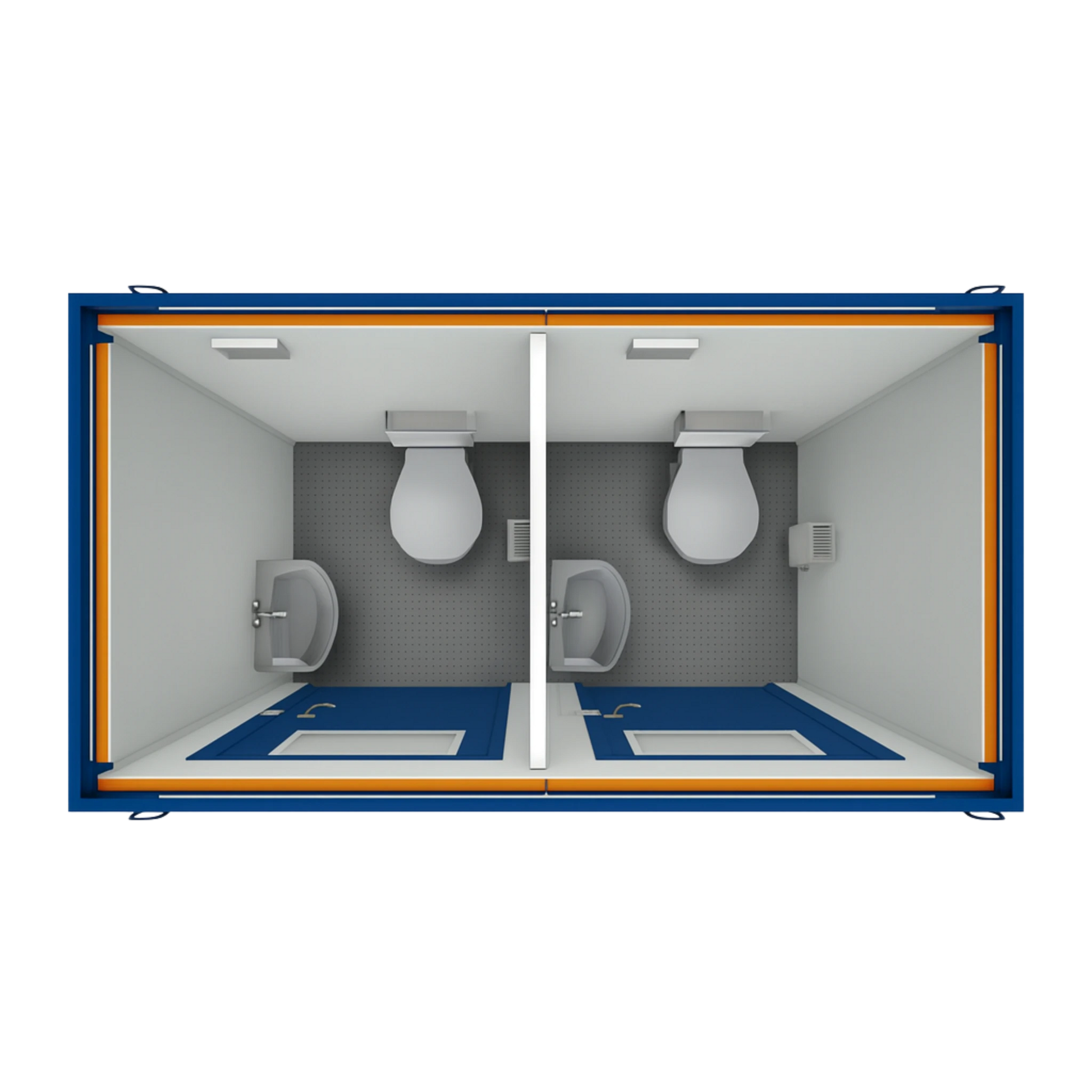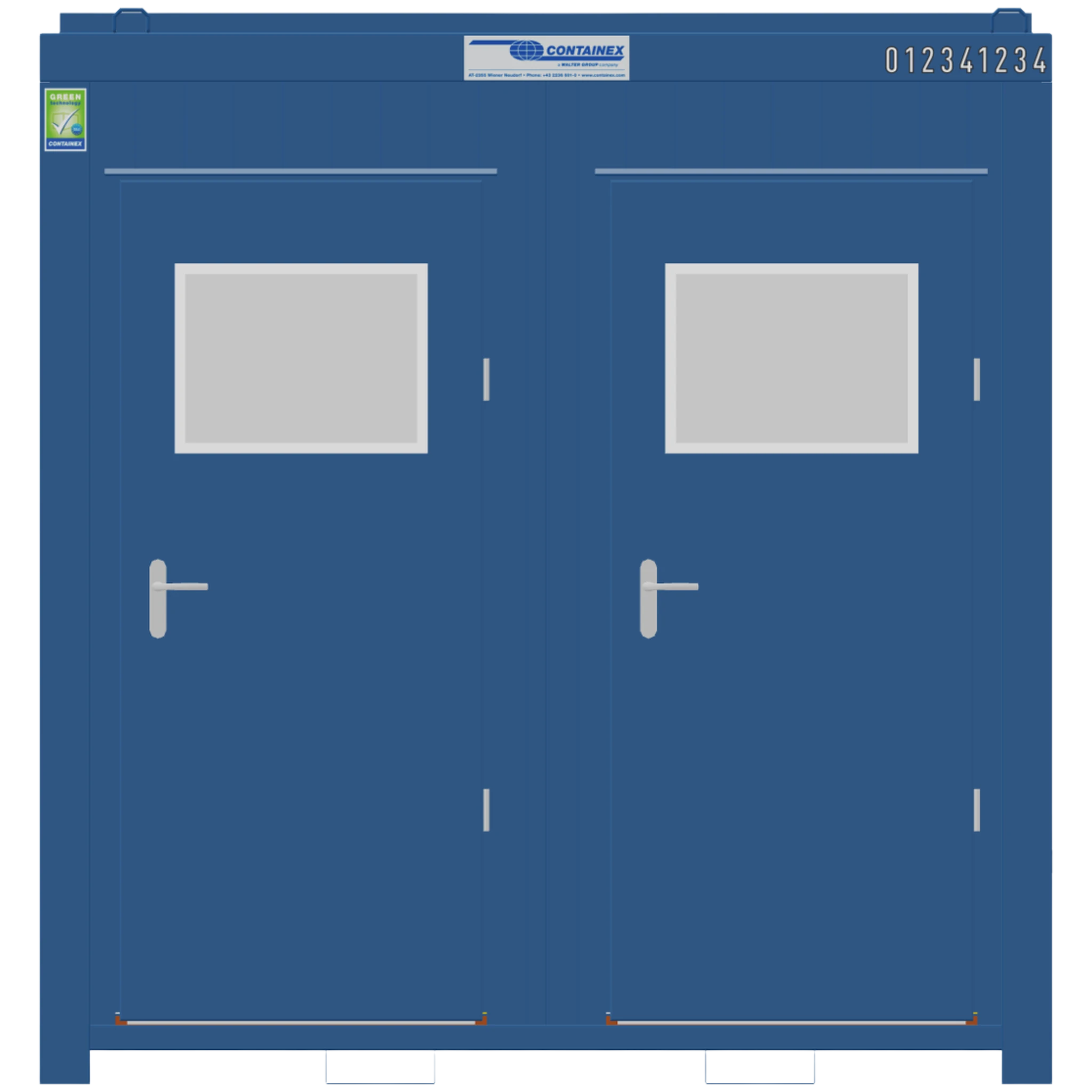 Dank der separaten Außentüren mit Sichtschutzglas können Damen und Herren oder Personal und Besucher klar getrennt werden. Die PU-Wanddämmung (45 mm) sowie Mineralwolldämmung in Boden und Dach ermöglichen den Einsatz ganzjährig – auch bei niedrigen Temperaturen. Die versenkten Zu- und Abläufe im Paneel erleichtern den Anschluss vor Ort und machen den Container schnell einsatzbereit.