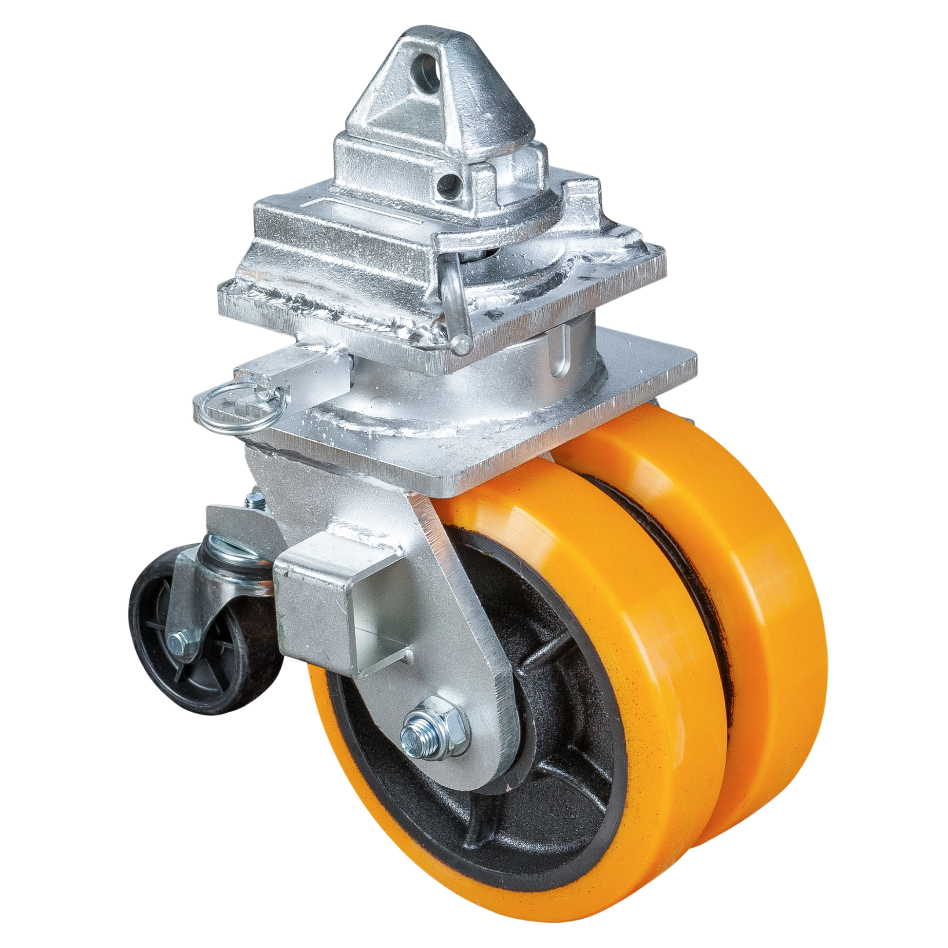 Die massiven Gusskerne in Kombination mit einer verschleißfesten PU-Lauffläche sorgen für ein ruhiges, vibrationsarmes Fahrverhalten und hohe Bodenschonung. Ideal für Anwendungen, bei denen Container regelmäßig verschoben oder neu ausgerichtet werden müssen – etwa in Produktionshallen, Logistikzentren oder Werkstätten.