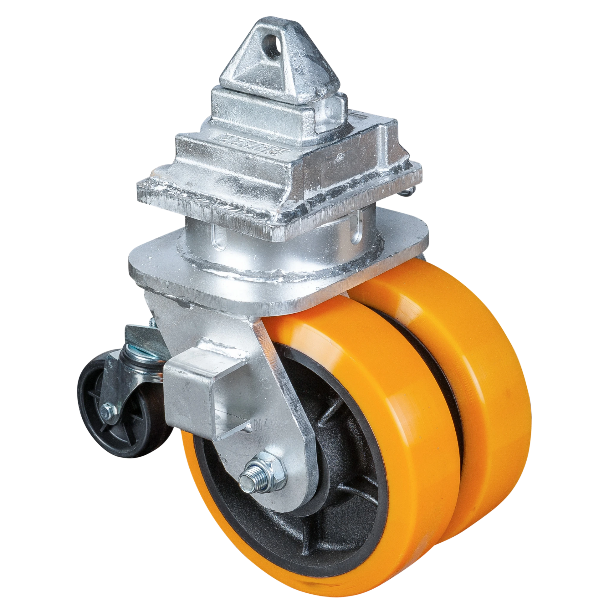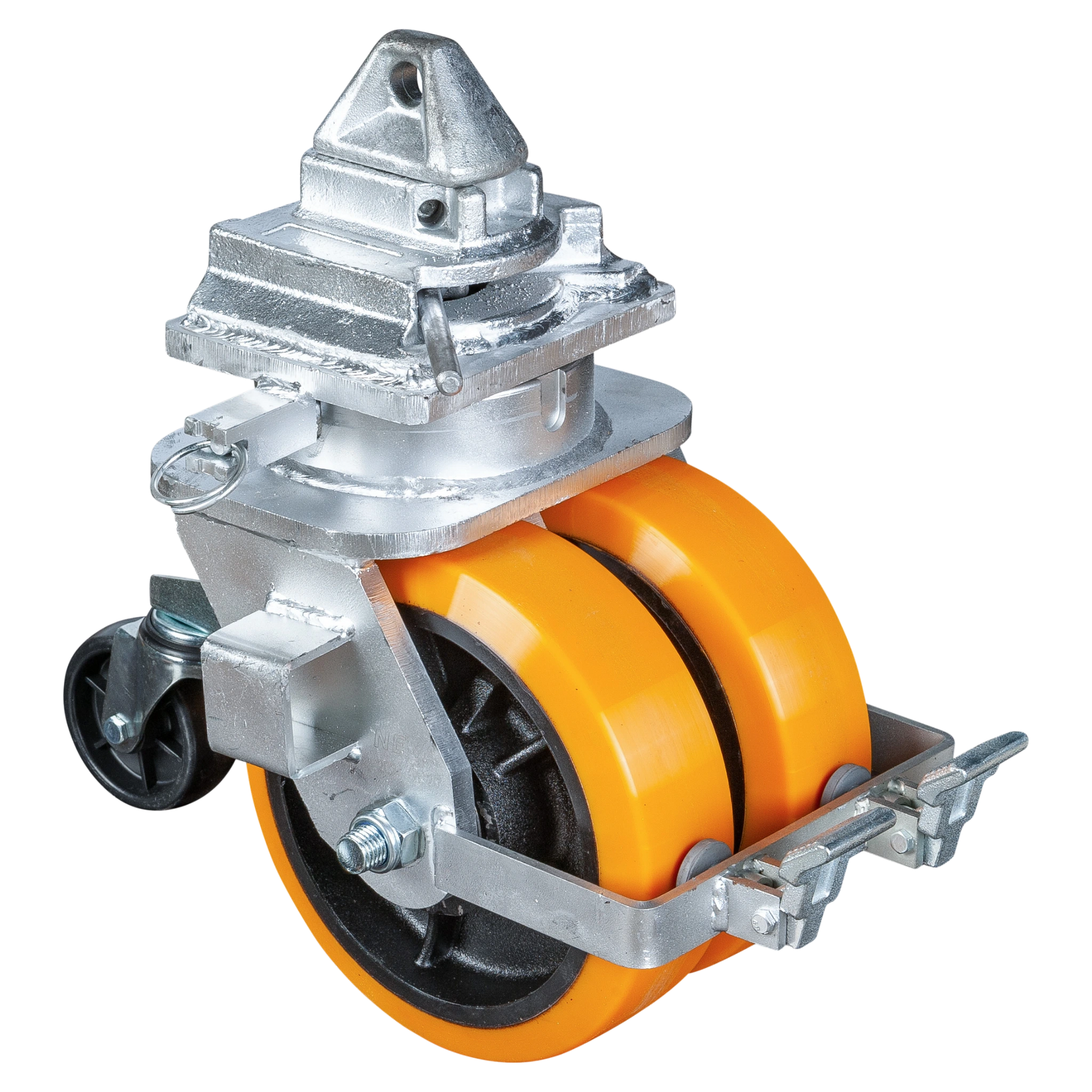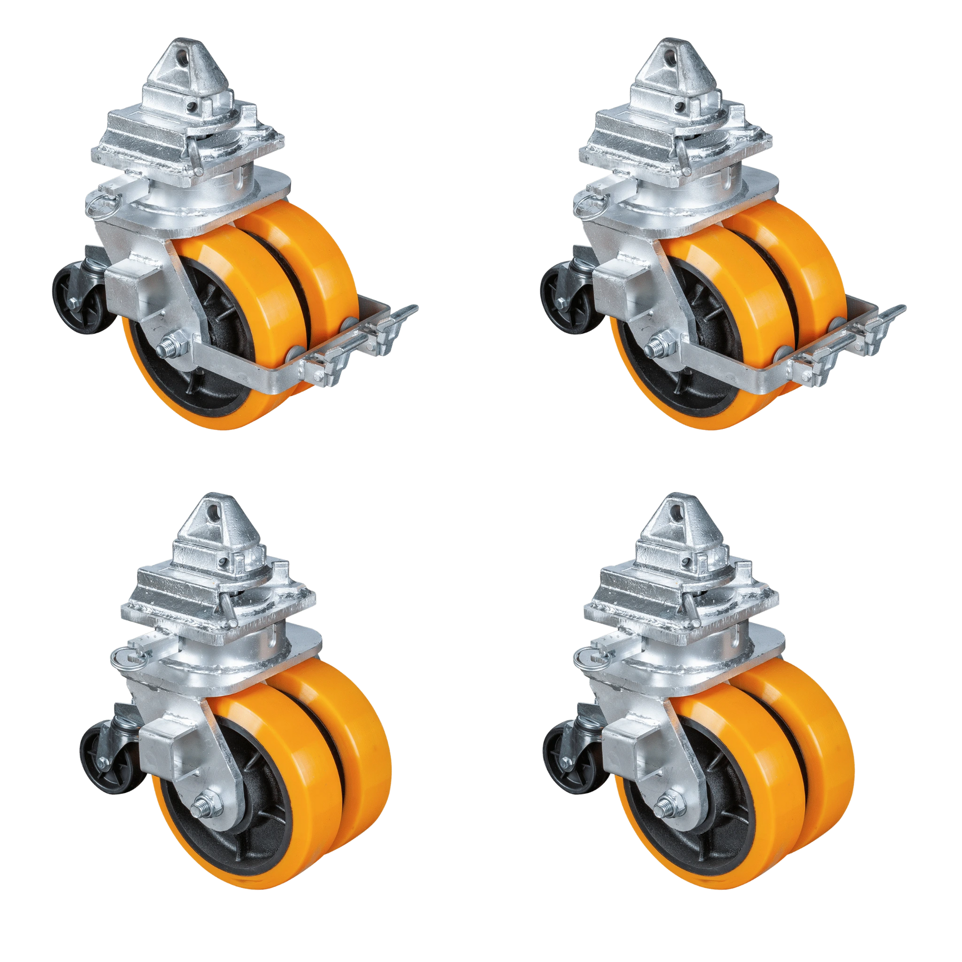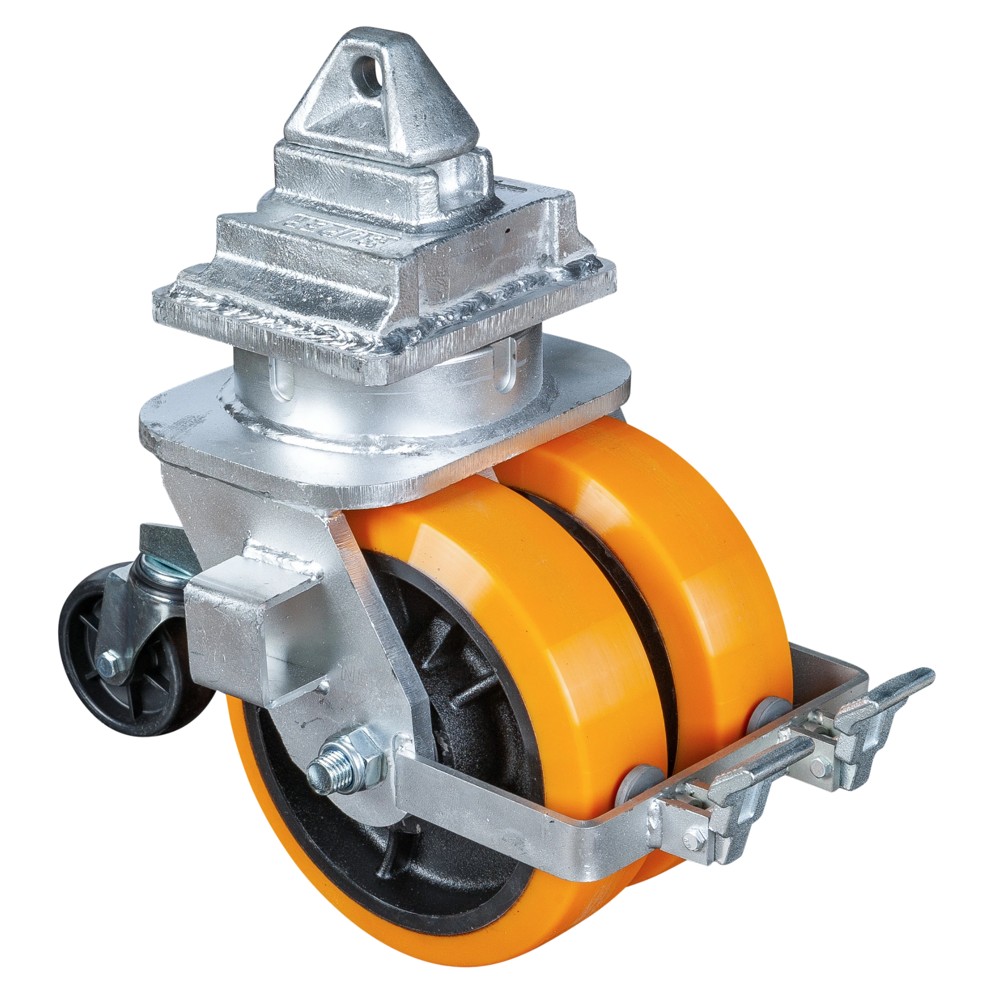 Die massiven Gusskerne mit doppelter PU-Lauffläche (76 mm Breite) sorgen für einen extrem ruhigen Lauf, hohe Bodenhaftung und maximale Lastverteilung.