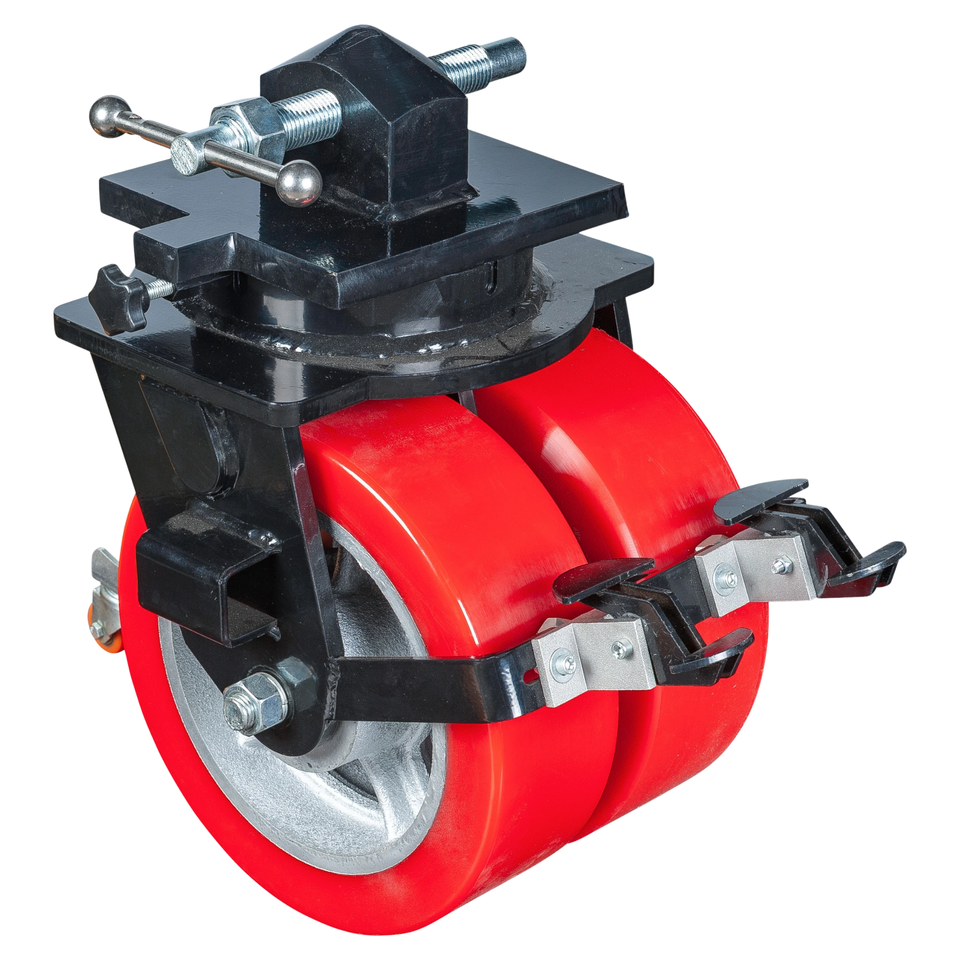 Die hochbelastbaren Doppelrollen mit PU-Lauffläche (100 mm Breite) gewährleisten ein ruhiges, vibrationsarmes Fahrverhalten sowie optimale Lastverteilung.