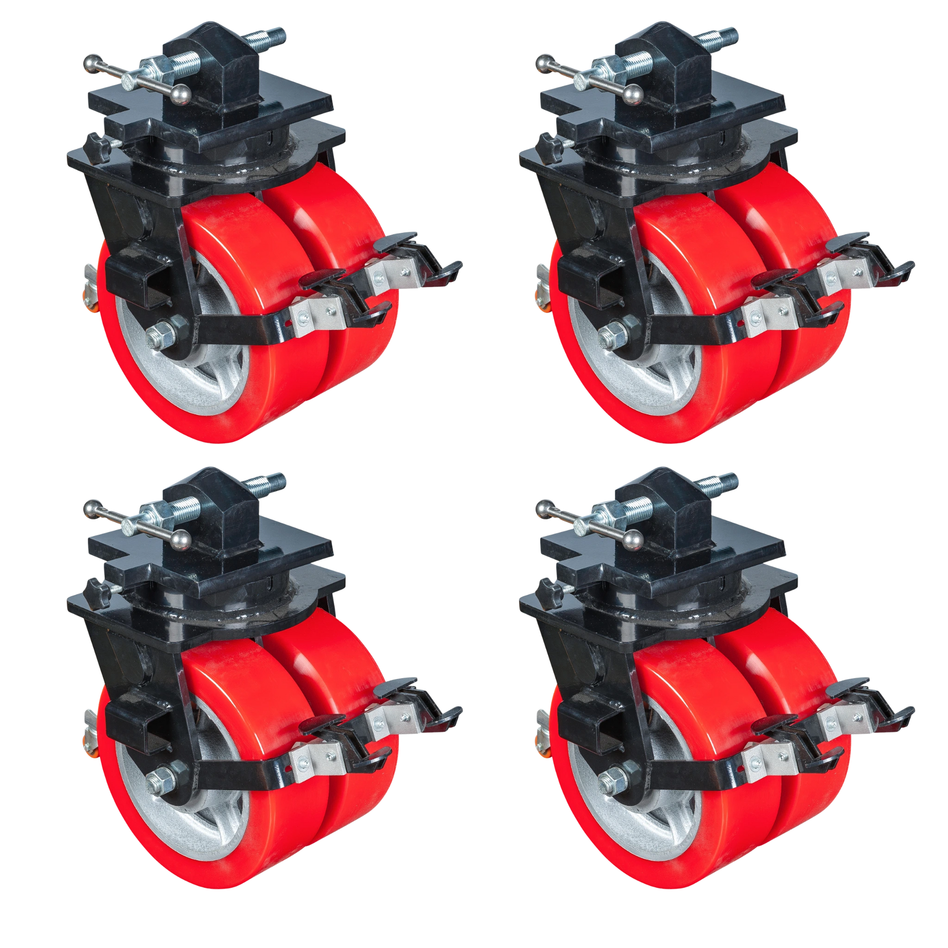 Das Set besteht aus vier Lenkrollen mit Feststeller und ermöglicht präzises Rangieren auf glatten, ebenen Hallen- und Werkstattböden.